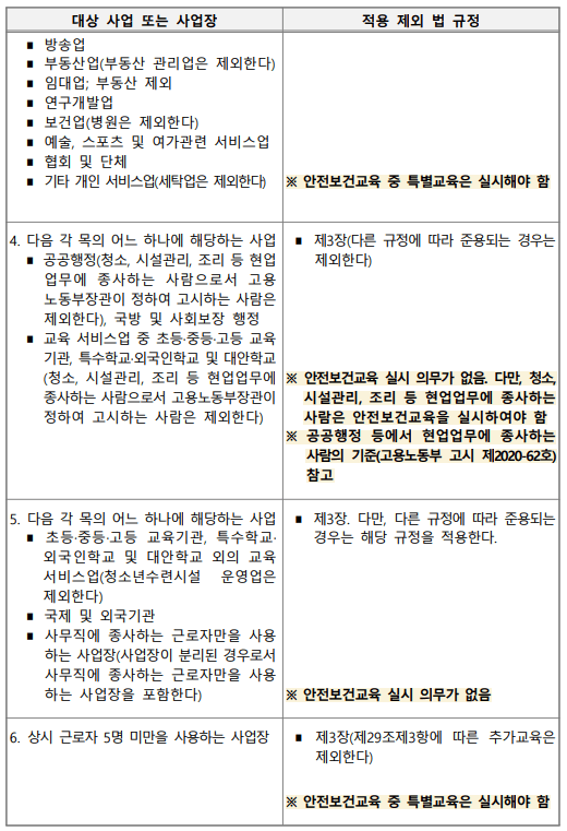 근로자 안전보건교육은 일반적으로 모든 사업(장)에서 실시하여야 하나, 산업안전보건법에서 일부 사업(장)에 대해서 교육 의무를 제외하고 있습니다. 규정에 따른 사업에 둘 이상 해당하는 사업의 경우에는 각각의 호에 따라 적용되는 규정은 모두 적용하지 않습니다. 대표적으로 상시근로자 5명 미만인 사업장은 안전보건교육을 받지 않아도 됩니다. 이 경우에도 안전보건교육 중 특별교육은 받아야 합니다.
